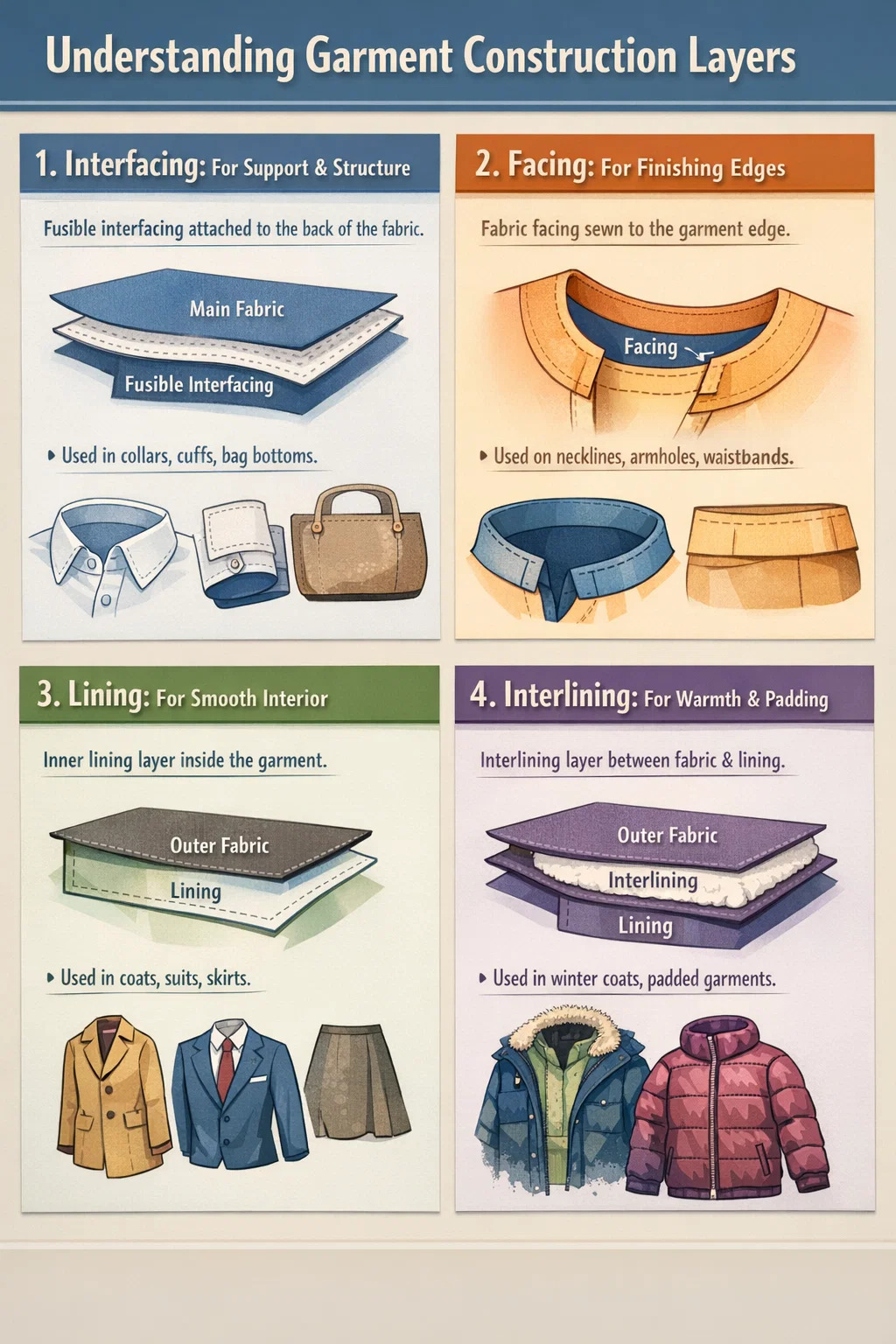 هنگام ساخت لباس یا کیف، این چهار مفهوم ممکن است کمی گیج کننده به نظر برسند، اما در واقع مانند قسمت های مختلف تقویت کننده و دکوراسیون فولادی هستند که در ساخت خانه استفاده می شود. برای استفاده موثر از آنها، نکته کلیدی این است که بفهمیم هر کدام در کجای ساختار کلی "ایستاده اند".