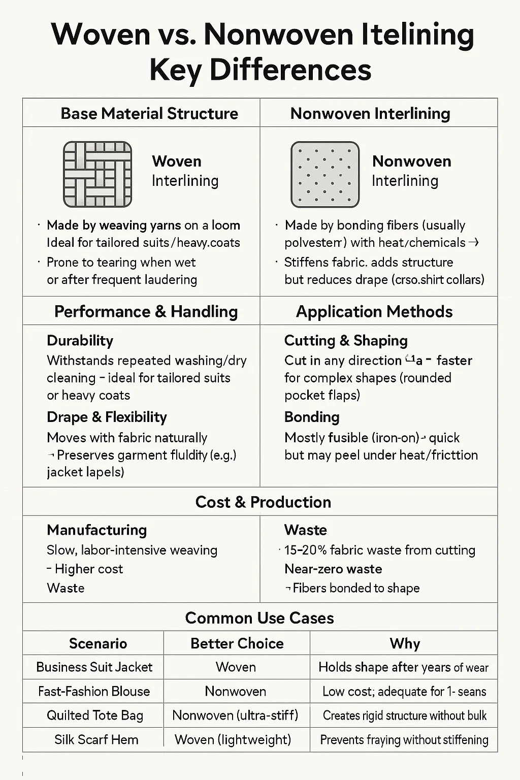 Nonwoven: پارچه سفت و سخت → ساختار را اضافه می کند اما باعث کاهش پارچه می شود (به عنوان مثال ، یقه های پیراهن واضح).