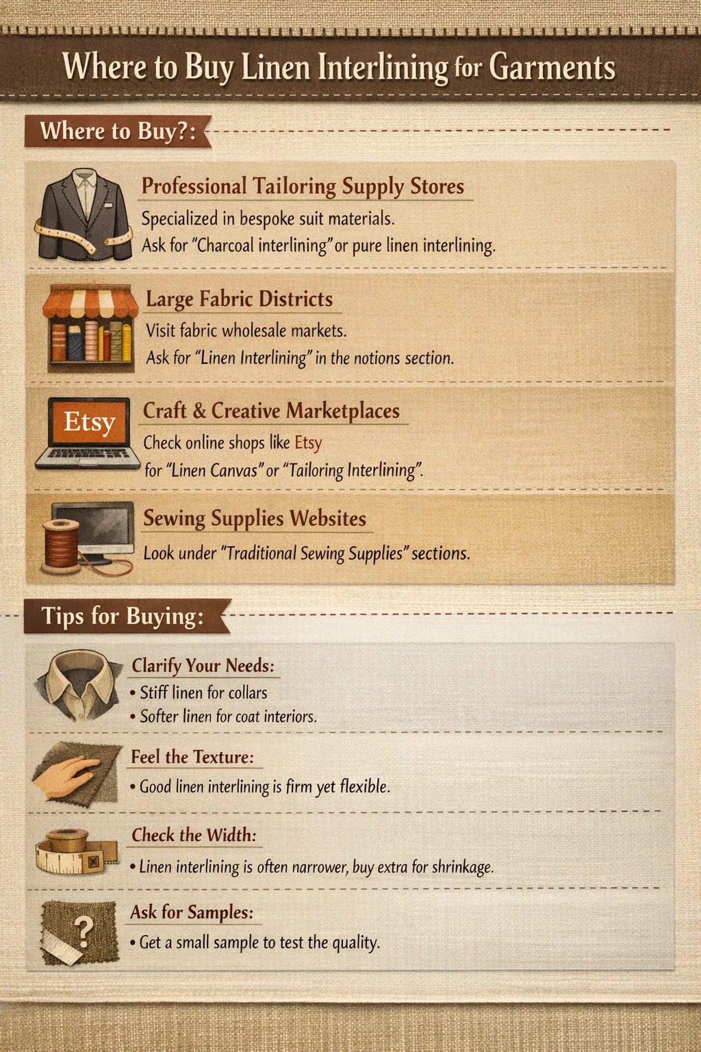 اگر به دنبال خرید کتانی هستید خط کشی یا رابط برای ساخت پوشاک، چندین منبع قابل اعتماد وجود دارد که می توانید کشف کنید. از آنجایی که کتان یک ماده نسبتاً سطح بالا است که در کت و شلوارهای سفارشی و لباسهای آماده با کیفیت بالا استفاده میشود، باید در فروشگاههای پارچه تخصصی جستجو کنید.